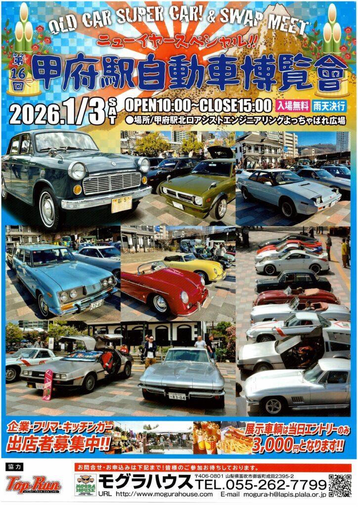 甲府駅北口で開催される自動車展示イベントです。オールドカーやスーパーカーが集結し、新春スペシャルとして開催されます。会場ではさまざまな車両の展示が行われ、企業・フリーマーケット・キッチンカーの出店者募集も行われています。入場無料で雨天決行のイベントです。